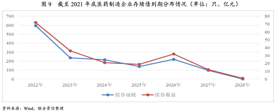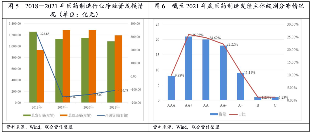 行業(yè)債務(wù)負擔(dān)加重,2021年醫(yī)藥制造行業(yè)債券到期規(guī)模較大,凈融資規(guī)模呈凈流出狀態(tài)。行業(yè)內(nèi)發(fā)債企業(yè)主要集中于AA+級別民營企業(yè)。