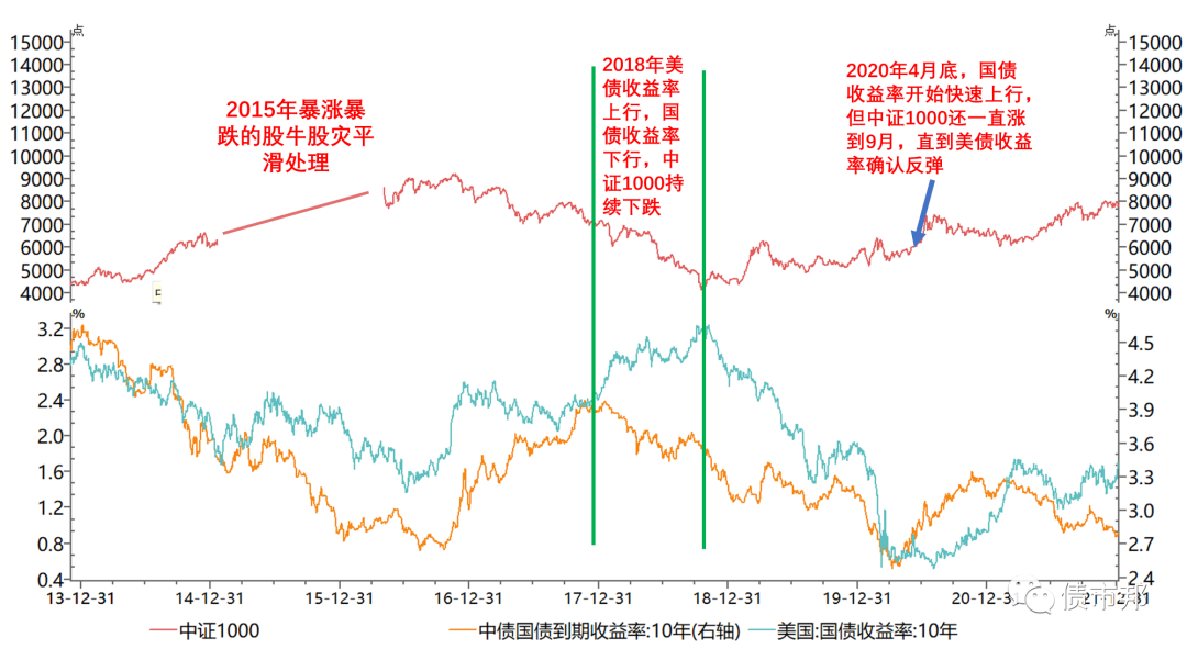從下圖可以看到,中證1000指數(shù)的重要拐點(diǎn),均與美債的底部頂部密切相關(guān)。