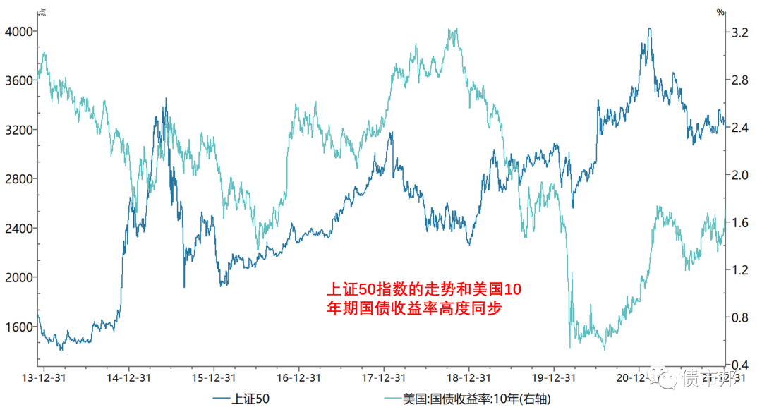 有意思的是,代表大票的上證50指數(shù),卻和小票相反,走出了和美債高度正相關(guān)的走勢(shì)。