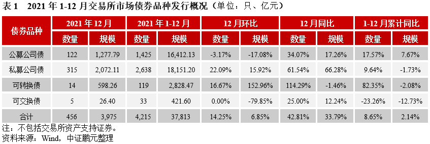 2021年12月份,我國交易所市場共發(fā)行信用債券456只,發(fā)行規(guī)模3,975億元;發(fā)行數(shù)量和規(guī)模環(huán)比分別上升14%和7%,私募公司債本月發(fā)行較多。其中,公募公司債發(fā)行122只,發(fā)行規(guī)模1,277.79億元,環(huán)比分別下降3%和17%,同比分別上升34%和17%;私募公司債發(fā)行315只,發(fā)行規(guī)模2,072.11億元,數(shù)量環(huán)比上升22%,規(guī)模環(huán)比上升16%,同比分別上升62%和66%;可轉債和可交換債分別發(fā)行14只和5只。