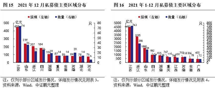 私募債券方面,2021年12月份,私募債券的發(fā)行人分布于26個地區(qū),以江蘇、山東、浙江等地為主。從發(fā)行規(guī)模來看,江蘇發(fā)行449.76億元位居榜首,山東發(fā)行239.28億元位居第二,浙江發(fā)行207.08億元位居第三位,發(fā)行數(shù)量分別為74只、36只、23只。從凈融資來看,12月份江蘇、浙江、山東分別以凈融資196.71億元、151.08億元、150.44億元位于前三位,廣東、貴州、海南分別凈償還39.67億元、16.98億元、13.50億元。綜合1-12月,江蘇以發(fā)行743只、累計發(fā)行規(guī)模4,489.72億元位居首位,遠高于其地地區(qū);浙江以發(fā)行386只、累計發(fā)行規(guī)模3,294.52億元位居第二;山東以發(fā)行264只、累計發(fā)行規(guī)模1,860.44億元位居第三;浙江、江蘇、山東分別以累計凈融資2,561.34億元、2,038.67億元、950.47億元位于前三位,北京、天津、上海分別凈償還495.34億元、452.00億元、314.94億元。