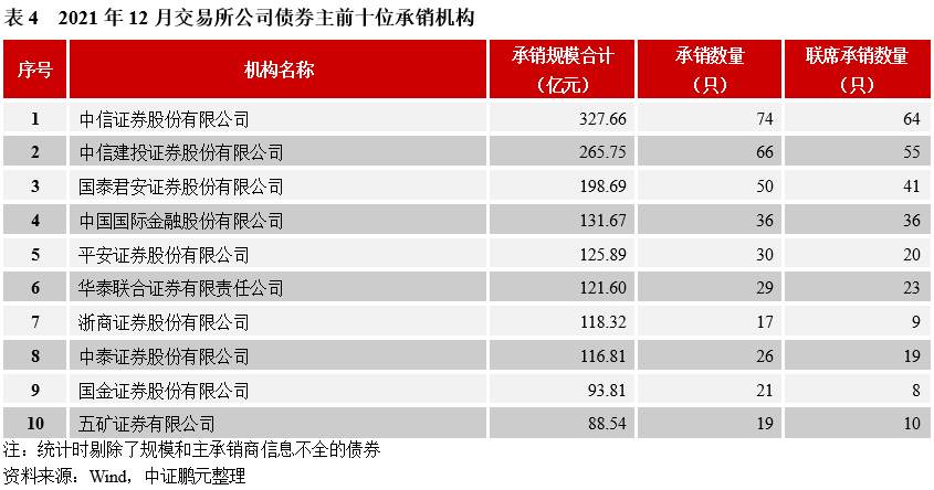 主承銷商方面,12月份共82家機構參與交易所公司債券承銷,中信證券、中信建投證券和國泰君安的承銷規(guī)模分別位居前三位。