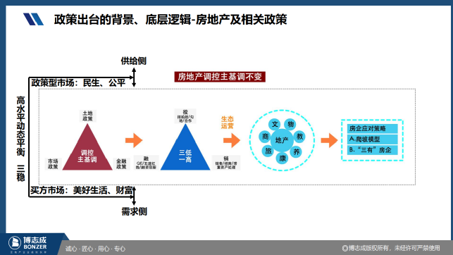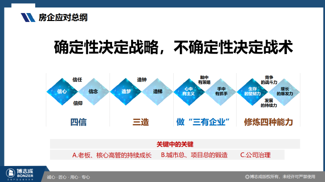 戰(zhàn)術。房地產(chǎn)行業(yè)未來依然是15-20萬億的大行業(yè),面對意料之外、情理之中的密集政策,房地產(chǎn)企業(yè)如何創(chuàng)新戰(zhàn)術、堅守戰(zhàn)略?
