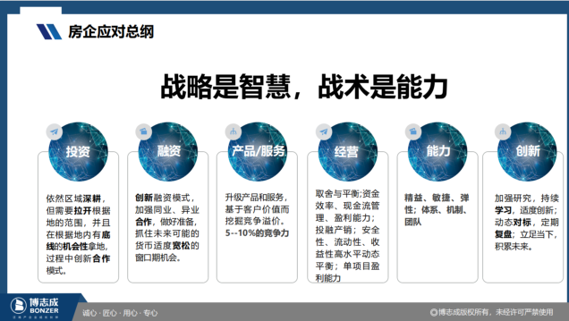 戰(zhàn)略是智慧,戰(zhàn)術是能力。房地產(chǎn)企業(yè)要關注投資、融資、產(chǎn)品/服務、經(jīng)營、能力、創(chuàng)新的落地綱領: