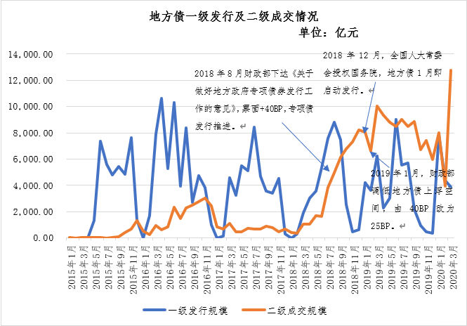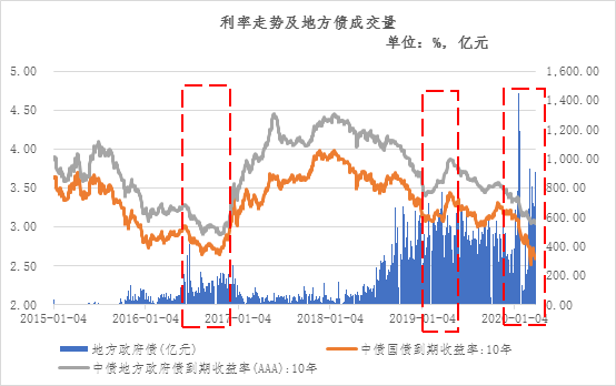 所謂地方債發(fā)行節(jié)奏改革,即根據(jù)2018年8月財政部所頒布《意見》要求,各地區(qū)加快專項債發(fā)行進(jìn)度,當(dāng)月地方債發(fā)行規(guī)模即創(chuàng)出歷史新高,疊加彼時上浮40BP的票面政策,一二級市場存在較大套利空間,量升價優(yōu),地方債二級市場交易量也創(chuàng)出新高。其后,為提升地方債對基建拉動效用,平衡全年發(fā)行節(jié)奏,2018年末全國人大常委會授權(quán)國務(wù)院可提前下達(dá)下一年度部分地方債務(wù)額度。受此影響,自2019年1月開始,地方債一級市場一季度就形成“開門紅”局面,發(fā)行量遠(yuǎn)高于四季度,該局面一直延續(xù)至今日。該制度改革的伴生影響則是,一季度地方債交易活躍度也大幅提升,部分時間高于受獲利了解影響交易規(guī)模大增的四季度。