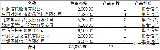 根據(jù)界面新聞的報道,“17騰邦01”債券違約之后的訴訟,泄露出13家機構(gòu)名單(報道詳見https://www.jiemian.com/article/6122466.html)。而讓債券民工很意外的是,這13家機構(gòu)名單中,共有7家信托公司,涉及了17只集合信托產(chǎn)品!債券民工根據(jù)公開信息整理了這7家信托公司在“17騰邦01”中的具體投資情況,詳見下表: