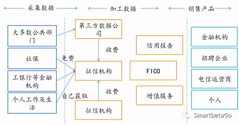 征信產業鏈由上游的數據生產者、中游的征信機構及下游的征信信息使用者三者構成,其中中游的征信機構主要負責數據收集、 數據加工處理及銷售產品,其核心競爭力則在于數據源完整度、數據覆蓋人群完整性以及數據的分析畫像能力。