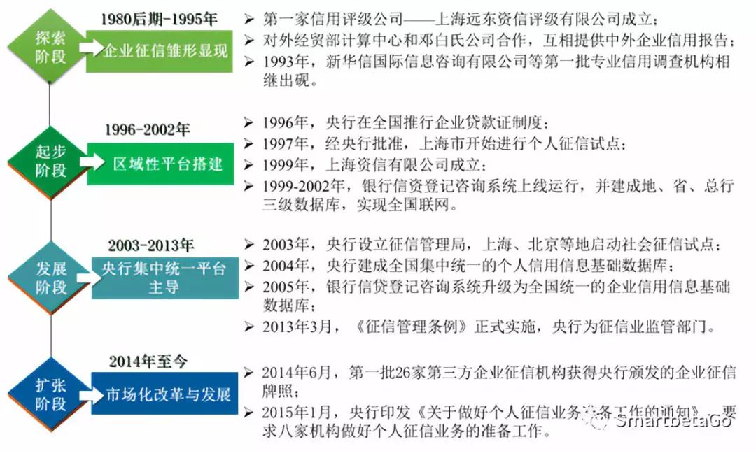 2003年,國務院賦予中國人民銀行“管理信貸征信業,推動建立社會信用體系”職責,中國人民銀行征信管理局正式成立,標志著中國征信事業邁出了前進的大步。