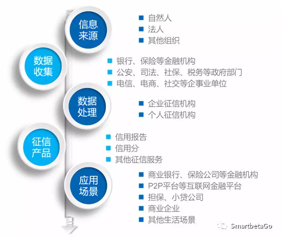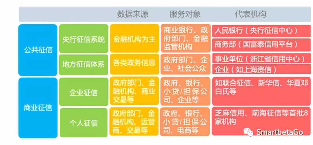 中國人民銀行征信中心(以下簡稱“央行征信中心”)(《征信業管理條例》(2013)):征信業務,指對企業、事業單位等組織的信用信息和個人的信用信息進行采集、整理、保存、加工,并向信息使用者提供的活動。