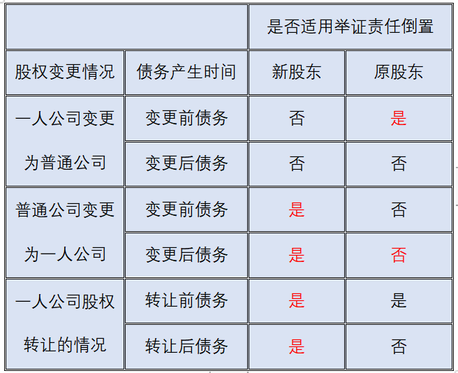 另外,對于變更為普通公司后新加入的股東,以及變更為普通公司后新產生的債務。一方面,因為新股東加入時,其利用一人公司的特殊治理結構隨意支配公司財產的客觀條件已不存在;另一方面,也不存在債權人會基于公司之前的登記公示信息而對公司當下的償債能力產生合理預期的可能。因此,對于新加入的股東以及變更為普通公司后新產生的債務,股東無需因舉證責任倒置而承擔連帶清償責任。
