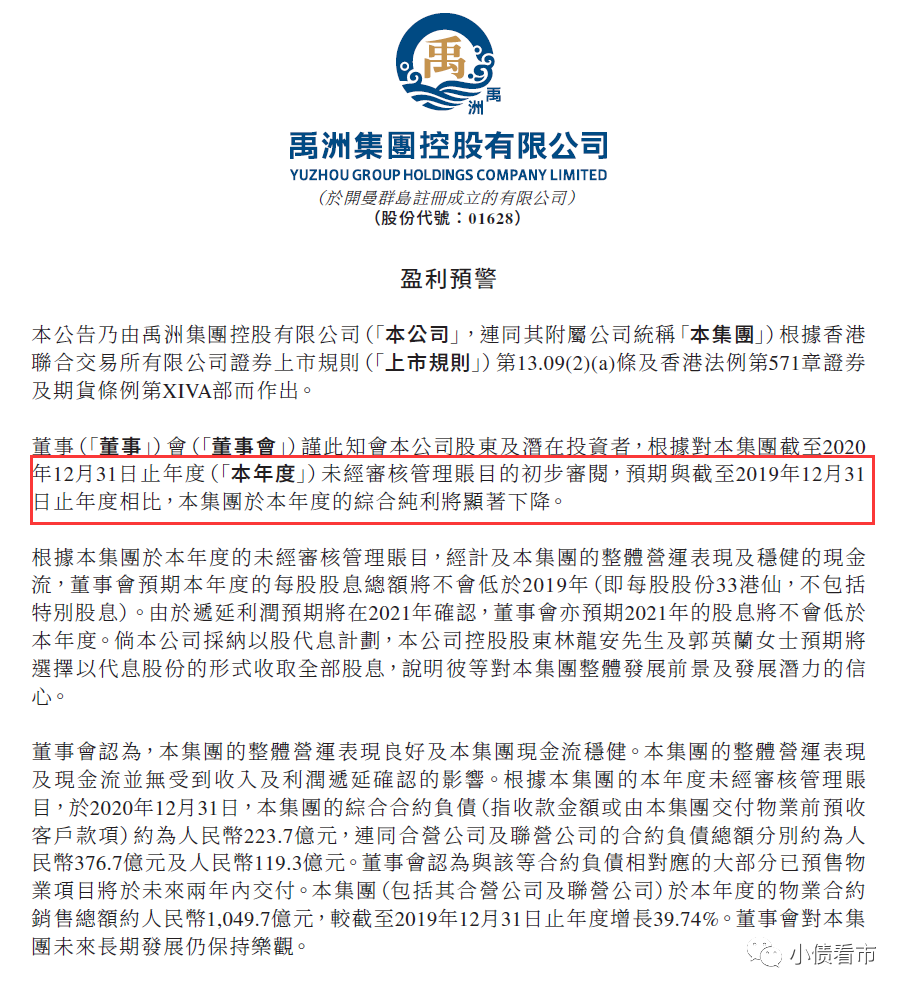 此前,禹洲集團發布盈利預警公告稱,2020年度的綜合純利將顯著下降。