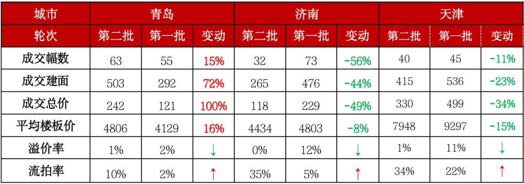 表:青島、濟南和天津2021年兩次集中土拍熱度對比(萬平方米、億元、元/平方米)