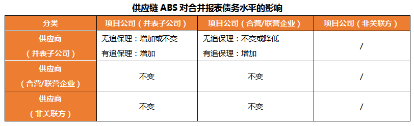 該情形下,項目公司作為核心企業的并表子公司,其應付賬款除了付款對象外并沒有發生其他變化。供應商既非核心企業的并表子公司,又非其聯營/合營企業,故供應商對核心企業報表沒有影響。所以發行供應鏈ABS對合并口徑的資產負債率沒有影響。