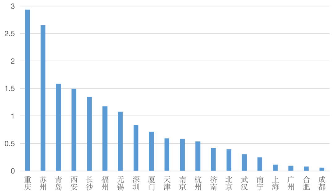 重點(diǎn)20城中,只有5個(gè)城市新項(xiàng)目規(guī)模超過(guò)1億平方米,其中重慶遙遙領(lǐng)先,新項(xiàng)目規(guī)模達(dá)到2.4億平方米,新項(xiàng)目規(guī)模占重點(diǎn)20城總規(guī)模比例已達(dá)14%。武漢緊隨其后,新項(xiàng)目規(guī)模達(dá)到1.6億平方米。