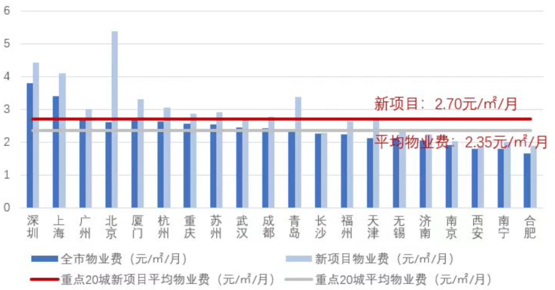 根據(jù)克而瑞物管監(jiān)測(cè),重點(diǎn)20城平均物業(yè)費(fèi)為2.35元/平方米/月,而樓齡5年及以下的項(xiàng)目平均物業(yè)費(fèi)為2.7元/平方米/月,相較于平均水平高出15%。