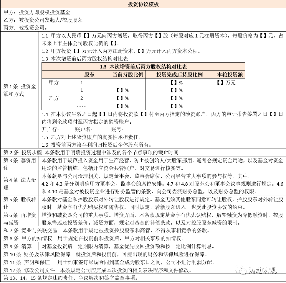 投資協議的主要條款包括估值條款、退出安排、公司管理安排,防稀釋措施、強制信息披露安排等方面。