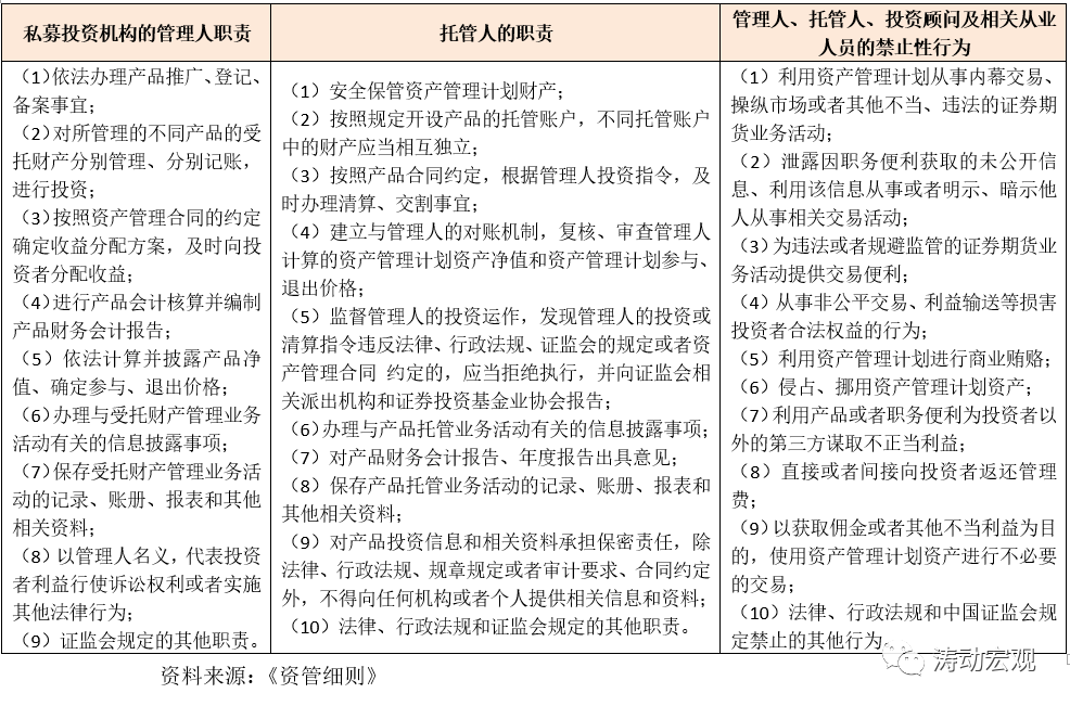 此外《資管細則》還對管理人、托管人的職責以及相關禁止行為進行了明確。