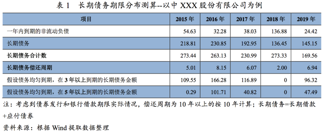 本文提出,在只有公開資料可獲取的情況下,可以通過公司長期債務中一年以內到期部分(在“一年內到期的非流動負債”科目計量)在整體長期債務中的占比測算長期債務償還周期和未來到期分布情況。