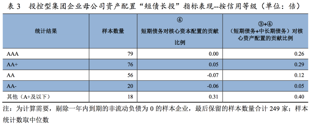 資產負債匹配程度是考察企業財務政策是否穩健的重要指標之一,本文通過對249家不同信用等級的投控型集團企業樣本母公司在資本配置方面的財務表現進行分析發現,高信用等級的企業母公司權益對核心資產的覆蓋程度反而更低,因為外部融資渠道方面的便利使得高信用等級的企業可以靈活選用“權益+杠桿”的模式滿足核心資產配置需要,從而有效控制資金成本、提升資金使用效率;而低信用等級的樣本企業核心資本配置對于自有權益的依賴程度相對較高,一定程度限制其經營規模的擴張;經營策略較為激進的企業甚至采用“短債長投”的策略,加大資金滾續壓力,在外部融資環境收縮的情況下面臨信用風險暴露的風險。