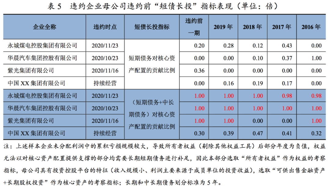 通過對近年來違約的投控型集團企業母公司進行分析,我們發現,投控型集團企業母公司中的違約樣本長期資本對核心資產的貢獻比例不足,“短債長投”現象普遍存在,并且,違約樣本企業可能在違約前的較長期間內資產負債錯配程度處于高位,最終在外部融資環境收縮的情況下發生信用風險暴露。本文提出的“短債長投”量化指標在揭示投控型集團企業母公司的資產負債錯配程度以及風險預警方面有一定借鑒意義。
