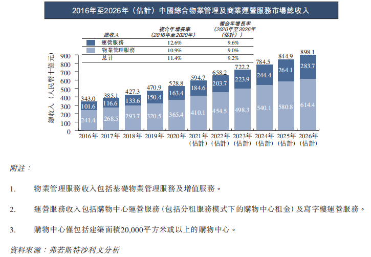 中國全業態物業管理及商業運營服務市場總收入由人民幣3,430億元增至人民幣5,288億元,復合年增長率為11.4%。2026年,總收入預期將達到人民幣8,981億元,2020年至2026年的復合年增長率為9.2%。