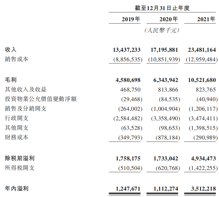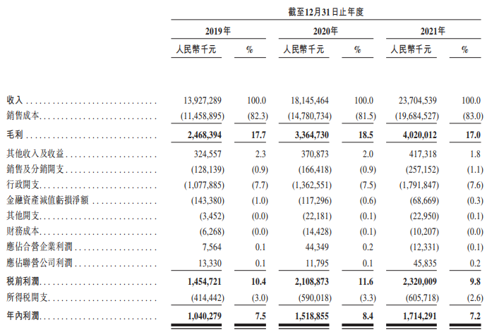 根據招股說明書顯示,截止2021年9月30日,收入由2020年9月30日的42.89億元增長至2021年9月30日的77.71億元;毛利也增長至21.454億元;毛利率為27.6%。