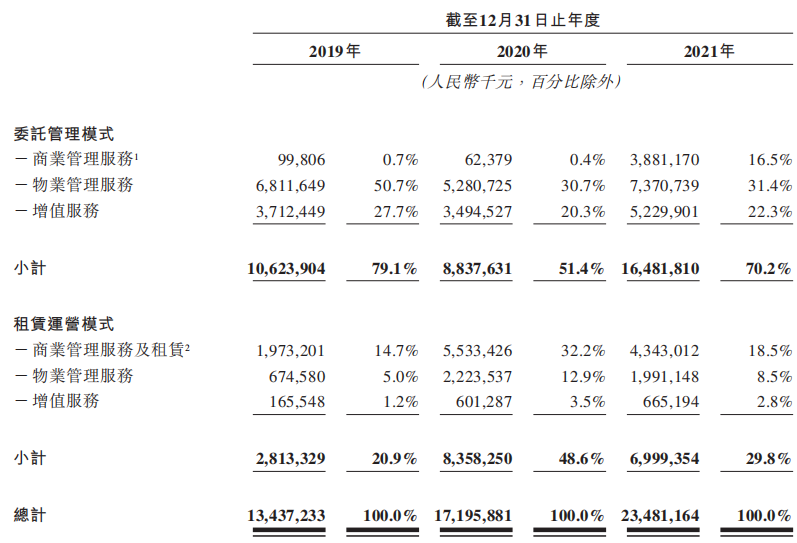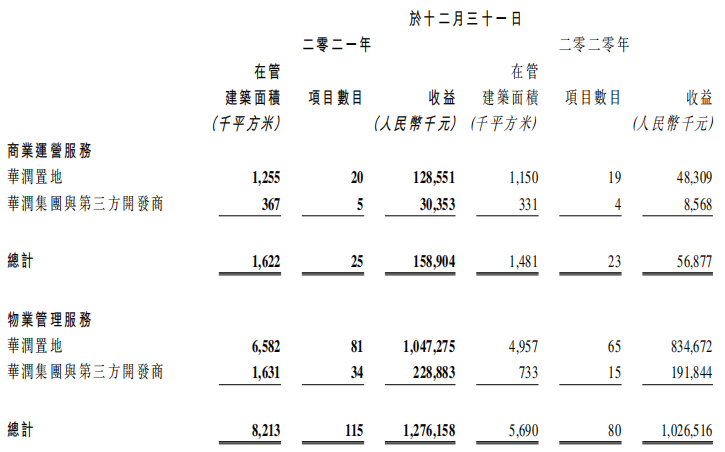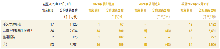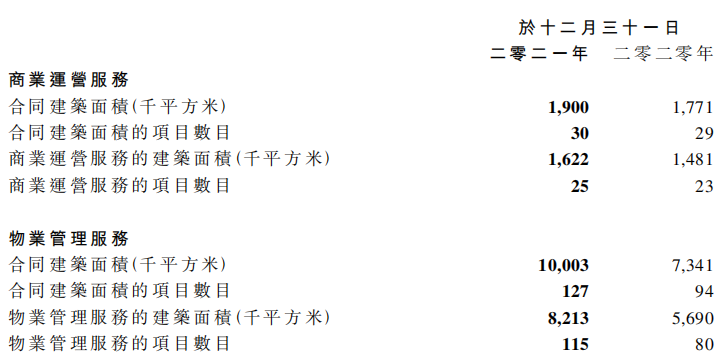 截至2021年底,集團住宅及其他物業管理業務覆蓋全國100個城市,合約面積1.859億平方米,在管面積1.468億平方米。提供商業運營服務的已開業購物中心數量為71個,已開業寫字樓數量為25個。