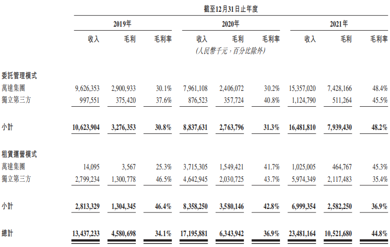 2021年,珠海萬達商管總收入234.81億元,毛利為105.22億元;毛利率為44.8%。