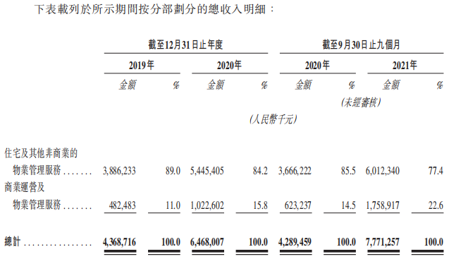 其中,住宅及其他非商業的物業管理服務占總收入的77.4%為60.12億元,商業運營及物業管理服務占總收入的22.6%為17.58億元。