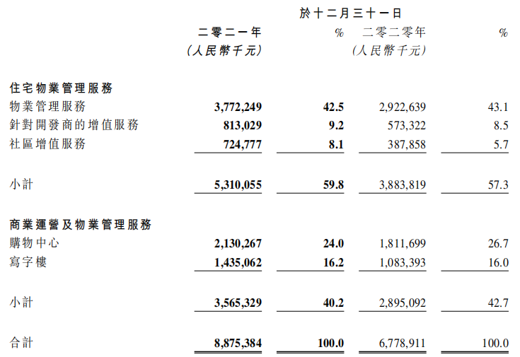 物管業務方面,報告期間內,全年實現收入人民幣53.1億元,同比增長36.7%;來自住宅物業管理服務的收入為人民幣37.723億元,較去年同期增長29.1%,占總收入42.5%。