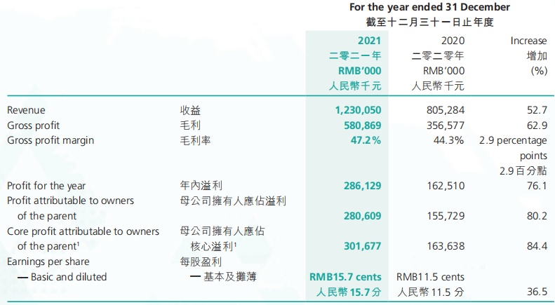 毛利約為人民幣3.304億元,同比增長約32.9%。毛利率為57.7%。年內應占利潤約為人民幣1.849億元,同比增加約45.8%。