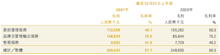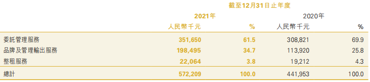報告期間內,集團的收入約為人民幣5.722億元,同比增長約29.5%。其中,來自委托管理服務的收入約為人民幣351.7百萬元,同比增長約13.9%,占總收入約61.5%;來自品牌及管理輸出服務的收入約為人民幣198.5百萬元,同比增長約74.2%,占總收入約34.7%;來自整租服務的收入約為人民幣22.1百萬元,同比增長約14.8%,占總收入約3.8%。
