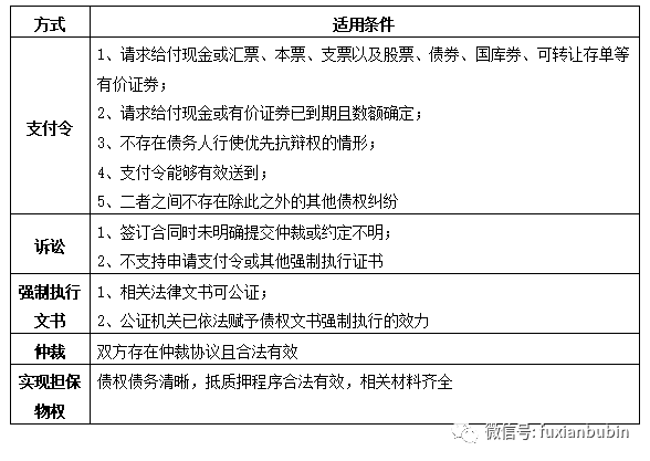 即通過民事訴訟、民商事仲裁、民事督促(支付令)、執(zhí)行公證債權(quán)文書、直接向法院申請實現(xiàn)擔(dān)保物權(quán)的方式,確立債權(quán)的合法性,依靠強制程序收回債權(quán)的清收處置方式。主要適用于債務(wù)人出現(xiàn)生產(chǎn)經(jīng)營陷入困境、財務(wù)狀況嚴(yán)重惡化,債務(wù)履行困難,停止?fàn)I業(yè)或?qū)嶋H控制人下落不明,債務(wù)人還款意愿差,有明顯轉(zhuǎn)移資產(chǎn)或逃廢債務(wù)的行為,主要負責(zé)人或?qū)嶋H控制人涉及刑事案件等情形。其具體適用情形如下表: