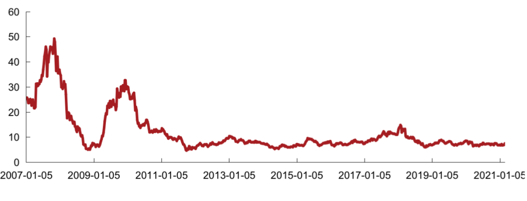 克而瑞內房股領先指數成分股相對香港地產股大樣本整體PE 2021年2 月進一步回升。2月該相對PE周均值為-1.8%,高于上周均值-4.7%,低于2020年周均值-1.5%。香港地產股大樣本2月整體PE周均值為7.27,低于上月周均值7.32,低于2020年至今周均值7.42。