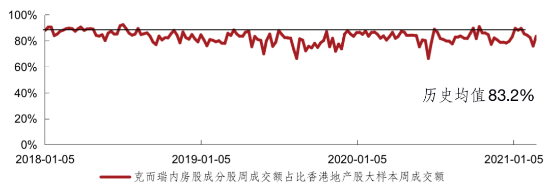 2月克而瑞內房股領先指數成交額占香港地產股大樣本的成交額比值總體較上月有所回落。2月該指數成交額占比周均值81.7%,低于歷史均值83.2%,低于上月周均值87.3%。