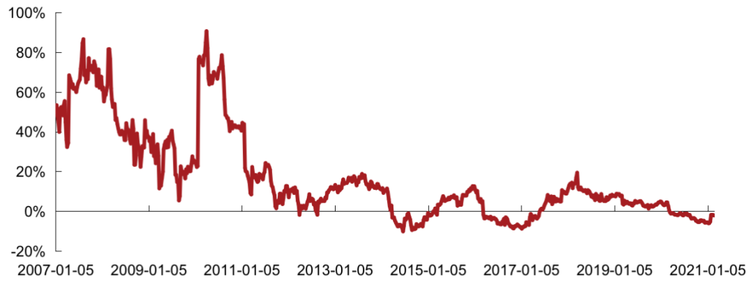 2021年2月克而瑞內房股領先指數估值平穩,大盤走勢上行,指數相對恒指PE繼續走低。2021年2月相對恒指成分股的PE周均值為-60.4%,低于上月相對PE周均值-60.0%,低于2020年全年相對PE周均值-40.2%。