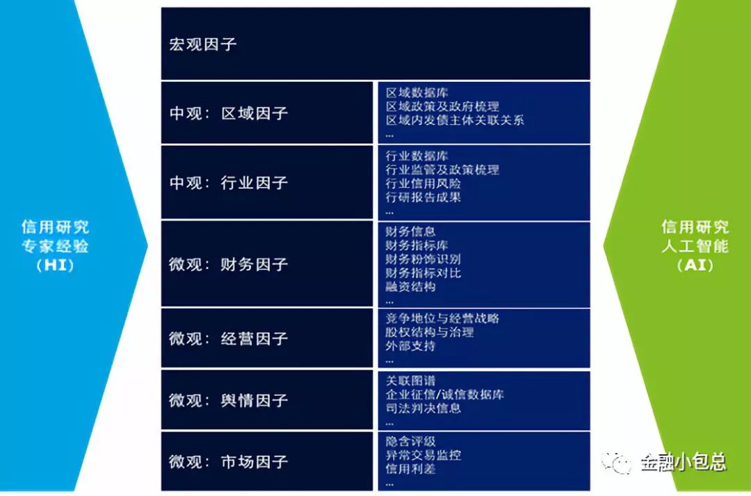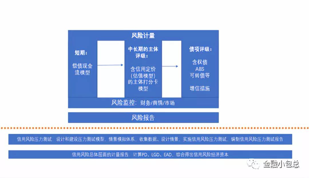 內評體系化建設的核心落腳點在于提升團隊的風險識別、風險計量、風險緩釋及處置能力。風險識別是信用風險評估入口的問題,風險計量是信用風險評估出口的問題。信用風險的評估環節入口應綜合專家經驗和人工智能兩套方法論,而信用評估的出口環節精細化信用研究成果如下圖所示: