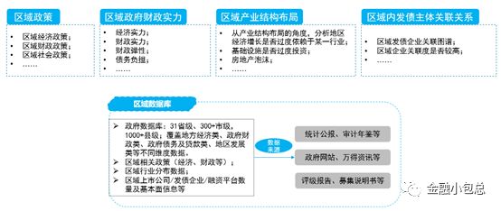 區域維度看,可以通過整理區域政策、區域政府財政實力情況、區域產業結構分布、區域內發債主體關系,搭建自己的區域數據庫,如下圖: