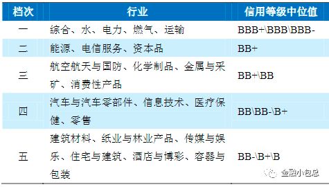 宏觀和行業維度看,大致可以分為三塊工作。第一是充分借鑒賣方行業研究的成果。第二是針對行業信用風險,梳理各行業信用研究的邏輯框架,抓住行業信用的顯著特性,監控每年度行業信用風險的變化,并根據行業景氣度確定行業中長期級別中樞??蓞⒖寄碌稀似?、惠譽給予不同行業敞口不同信用評級中樞的做法,如下圖: