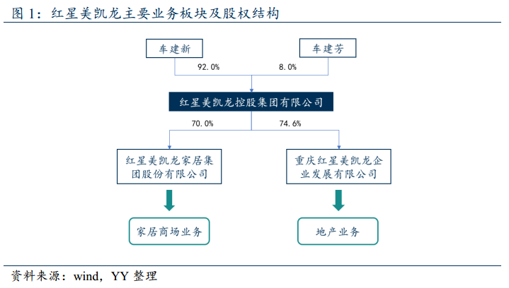 紅星美凱龍控股集團有限公司(以下簡稱“美凱龍控股”)1986年從一家家具小作坊起家,如今商場數量完勝萬達,成為全球“Mall王”。公司業務主要分為家居商場業務、商業地產及住宅開發業務兩大板塊,其中家居商場業務主要由子公司紅星美凱龍家居集團股份有限公司(以下簡稱“美凱龍家居”)負責,已經A+H股上市。商業地產及住宅開發業務主要由子公司重慶紅星美凱龍企業發展有限公司(以下簡稱“紅星企發“)負責。