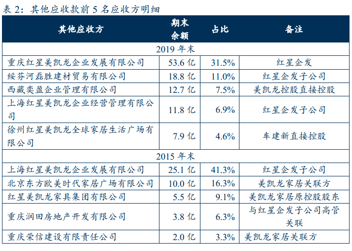 則僅看前5名應收方,2015-2019年,美凱龍控股通過其他應收款向紅星企發新增拆借資金55億元。除前5名之外的其他應收方沒有披露,但是從美凱龍家居2019報表來看,美凱龍家居及其納入合并范圍的子公司都沒有對美凱龍控股的其他應付款,因此可判斷美凱龍控股并沒有通過其他應收款將資金拆借給美凱龍家居,預計主要還是被紅星企發及其關聯方占用。