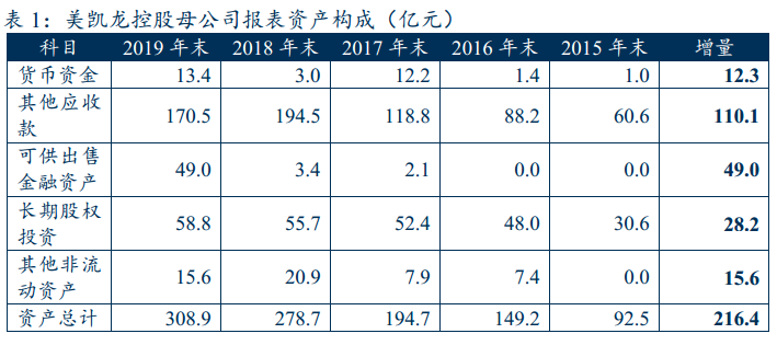 2015年末,母公司資產規模不到100億,至2019年末已經超過300億,期間負債規模更是從55億飆升至243億,翻了4倍,負債率從59.5%增長至78.9%,擴張十分迅猛。從資產構成來看,貨幣資金、其他應收款、可供出售金融資產、長期股權投資、其他非流動資產五個科目的規模占總資產規模比例基本在99%以上。