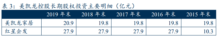 長期股權投資方面,2019年末,美凱龍家居和紅星企發合計占比約83%。2016年,美凱龍控股對紅星企發增加投資17.6億元,而對美凱龍家居僅在2019年增加投資1億元。