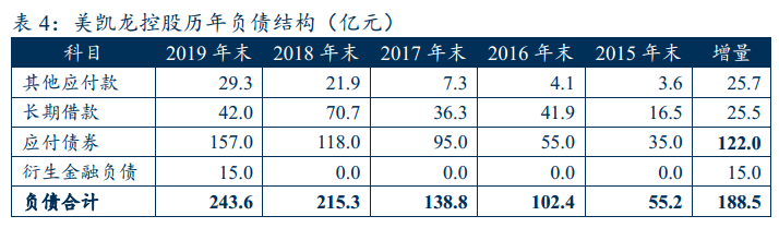 則經過對融資歷史的梳理以及一年內到期非流動負債重分類,可分析出從2015年末至2019年末,公司通過債券凈融資約137億元(不含出表ABS,可交債15億權益部分計入衍生金融工具),長期借款新增約12億元,其他應付款新增26億元。主要是依賴資本市場實現了舉債目的。
