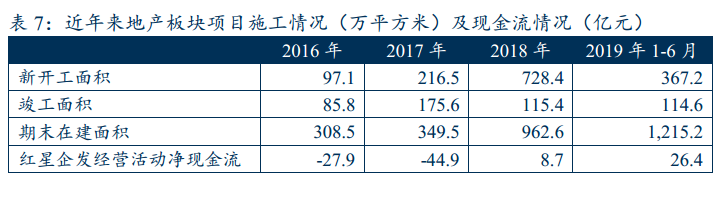 從現金流來看,由于近兩年項目去化情況較好,在2016年、2017年經營活動大額凈流出之后,2018年、2019年紅星企發都實現了經營活動現金流凈流入。不過公司2018年、2019年新開工面積很大,目前在建工程規模依然高企,截至19年6月末,公司在建項目52個,總投資額為1,220.3億元,已完成投資額 537.1億元,尚需投資約700億元。雖然公司采用滾動開發的方式能夠減輕資本支出壓力,但是如果出現銷售回款不順的情況,公司將騎虎難下,因此在建項目實際還是會構成資本支出壓力。