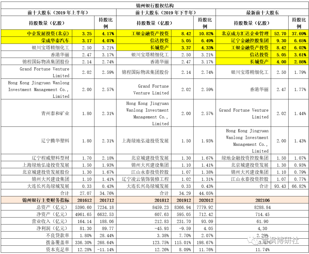 1、和包商銀行另起爐灶不同的是,錦州銀行則是通過債務(wù)重組來完成化險(xiǎn)改革。2019年,錦州銀行因年報(bào)延遲披露等原因而暴露風(fēng)險(xiǎn),在監(jiān)管部門的指導(dǎo)下進(jìn)行改革重組,引入工銀投資、信達(dá)投資、長城資產(chǎn)等戰(zhàn)略投資者(持有3.25億股的中企發(fā)展投資(北京)與持有3.17億股的榮成華泰汽車前兩大股東退出),并轉(zhuǎn)讓部分內(nèi)資股、剝離風(fēng)險(xiǎn)資產(chǎn)、實(shí)施增資擴(kuò)股。
