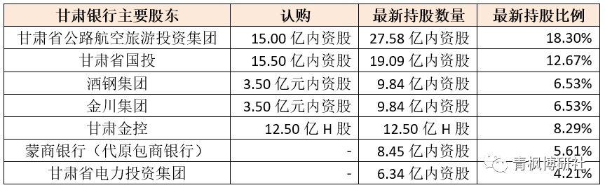 經(jīng)過此次改革重組后,甘肅省公路航空旅游投資集團(tuán)、甘肅省國投、酒鋼集團(tuán)、金川集團(tuán)、甘肅金控以及甘肅省電力投資集團(tuán)合計(jì)持有甘肅銀行的股權(quán)比例達(dá)到56.53%,蒙商銀行的持股比例則由之前的8.39%降至目前的5.61%、由第二大股東降至第六大股東。