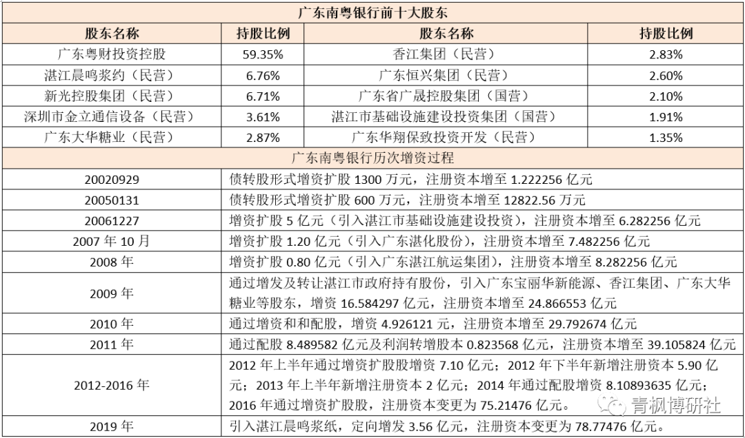 (三)廣東南粵銀行:原三家股東陷危機(jī),引進(jìn)第一大股東粵財(cái)投資控股 1、2021年12月27日,廣東銀保監(jiān)局核準(zhǔn)了南粵銀行的增資擴(kuò)股方案(增發(fā)115億股股份);同年12月31日,廣東銀保監(jiān)局同意南粵銀行注冊資本金由78.77476009億元增至193.77476009億元(即新增115億元)。此次增發(fā)的115億股股份,全部由廣東粵財(cái)投資控股認(rèn)購,認(rèn)購后廣東粵財(cái)投資控股持有廣東南粵銀行總股本的59.35%,成為后者第一大股東。