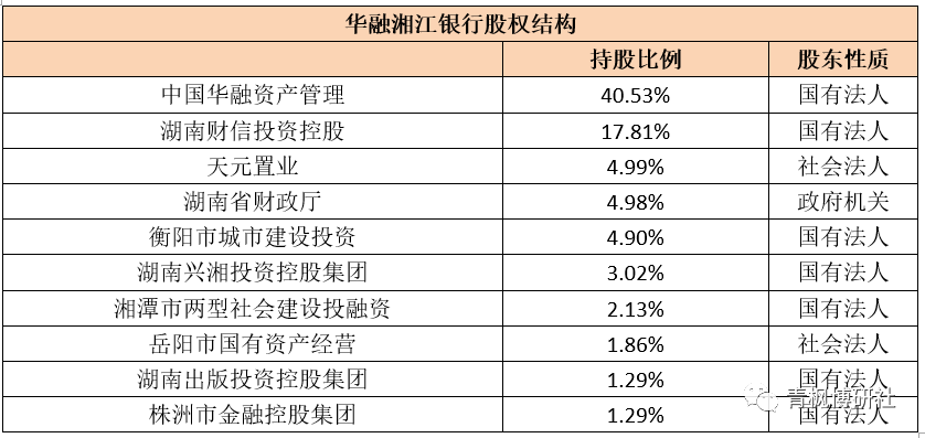 2、2010年10月,湖南省委省政府引入華融資產(chǎn),在重組湖南原株洲、湘潭、衡陽、岳陽市商業(yè)銀行和邵陽市城信社的基礎(chǔ)上新設(shè)而成(即四行一社)。成立時(shí)華融湘江銀行的注冊資本為40.80億元,華融占比5098%、四行一社原股東占比41.67%、其他股東占比7.35%。