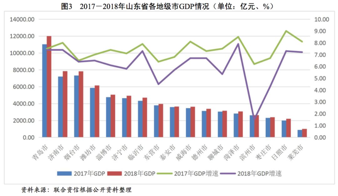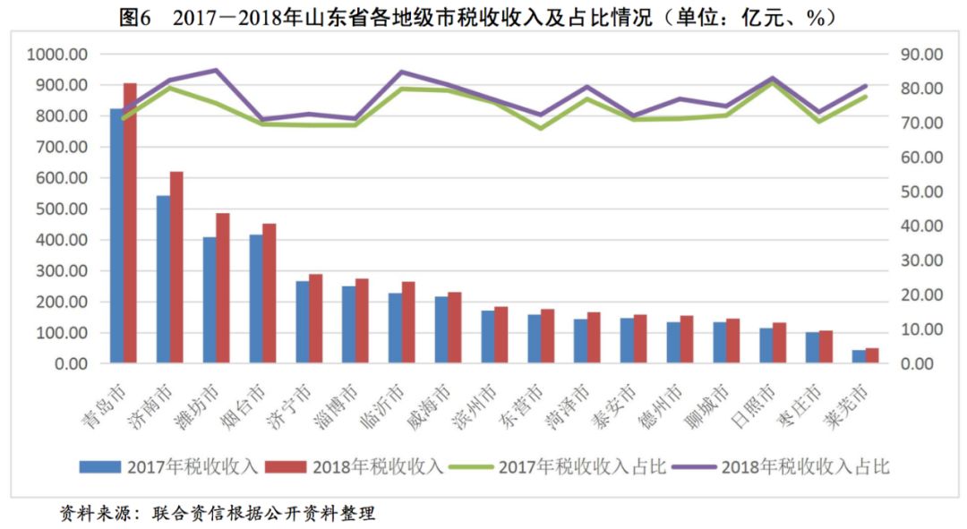 山東省經濟規模處于全國上游水平,2018年GDP排名全國第三,一般公共預算收入排名全國前列,政府債務率處于全國偏低水平,整體債務負擔輕。山東省各地級市經濟實力和財政收入分化較重,東部沿海城市和省會濟南市的經濟規模和財政實力明顯高于其他地級市。山東省各地級市一般公共預算收入質量較好,部分地級市政府債務負擔較重。